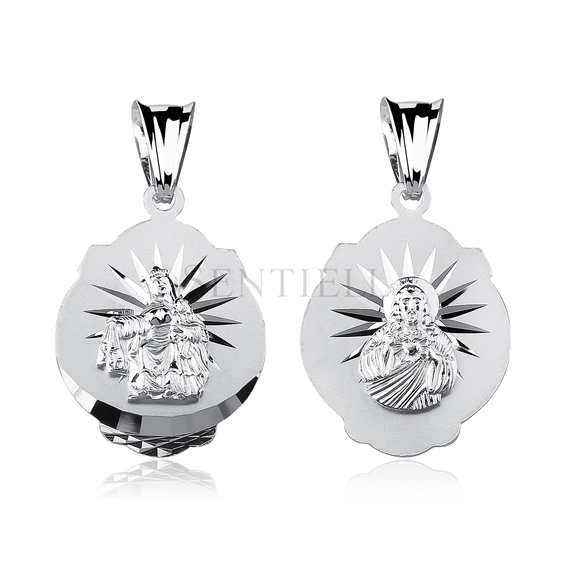 Dwustronny medalik w formie zawieszki wykonany ze srebra próby 925, z powierzchnią rodowaną i elementami diamentowanego wykończenia. Forma owalna o proporcjach około 26 mm długości i 15 mm szerokości, z delikatnie falowaną krawędzią. Awers przedstawia wypukły wizerunek Matki Boskiej Szkaplerznej z Dzieciątkiem, umieszczony na tle z promienistymi, diamentowanymi nacięciami podkreślającymi centralny motyw. Rewers zdobiony wizerunkiem Jezusa w reliefie, również osadzonym na promieniście opracowanym tle.