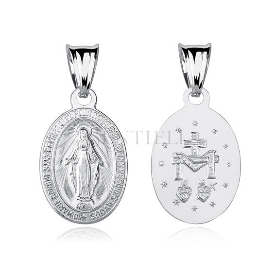 Dwustronny medalik w formie zawieszki wykonany ze srebra próby 925, z powierzchnią zabezpieczoną rodowaniem. Forma owalna o proporcjach około 25 mm długości i 12 mm szerokości, z gładką, regularną krawędzią. Awers przedstawia wypukły wizerunek Matki Boskiej Cudownej z promieniście opracowanym tłem oraz francuskimi napisami biegnącymi wzdłuż obwodu medalika. Rewers zdobiony symboliką maryjną w postaci krzyża połączonego z literą M, otoczonego gwiazdami oraz motywami serc, wykonanymi w wyraźnym reliefie na gładkiej powierzchni. Obie strony utrzymane w jednolitym, połyskowym wykończeniu.