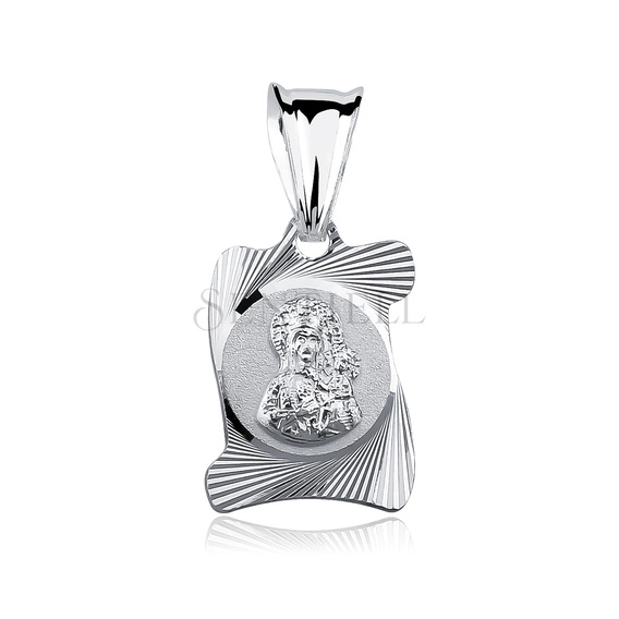 Medalik w formie stylizowanego zwoju wykonany ze srebra próby 925, rodowany. Centralnie osadzony okrągły medalion z wypukłym wizerunkiem Matki Boskiej Częstochowskiej z Dzieciątkiem, o wyraźnie zaznaczonym reliefie. Tło pod wizerunkiem ma powierzchnię drobno fakturowaną, natomiast otaczająca forma zwoju wykończona jest promienistym diamentowaniem tworzącym dynamiczny układ linii. Krawędzie nieregularne, profil pełny, kompozycja asymetryczna z czytelnym podziałem na część centralną i dekoracyjne obrzeże.