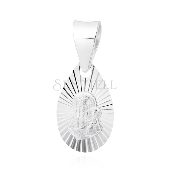 Medalik o smukłej, łezkowatej formie wykonany ze srebra próby 925, rodowany. Centralny wizerunek Matki Boskiej Częstochowskiej z Dzieciątkiem ukształtowany w wypukłym reliefie, osadzony na pełnym tle. Powierzchnia tła wykończona promienistym diamentowaniem, nadającym strukturę i kontrast wobec gładkiego reliefu. Krawędzie regularne, profil płaski, proporcje wąskie i wydłużone, charakterystyczne dla niewielkich medalików o formie pionowej.