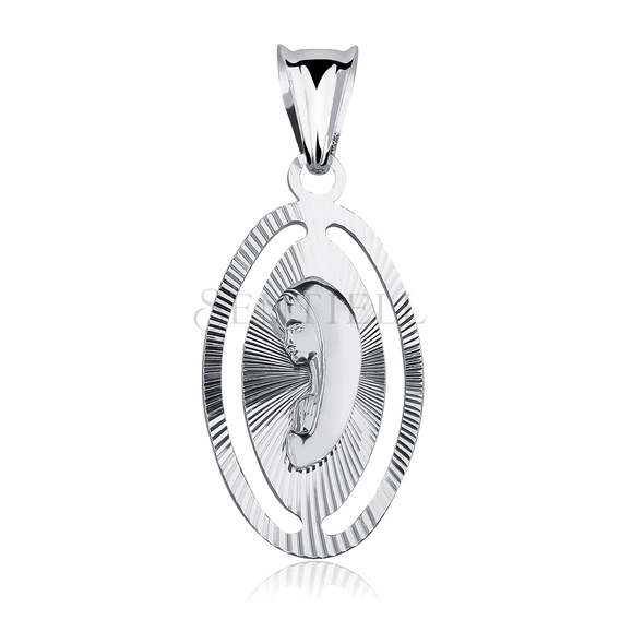 Medalik o wydłużonej, owalnej formie wykonany ze srebra próby 925, rodowany. Centralny wizerunek Matki Boskiej Madonna przedstawiony w wypukłym reliefie, ujęty w półprofilu. Tło wypełnione promienistym wzorem wykonanym techniką diamentowania, podkreślającym kierunek kompozycji. Zewnętrzna rama ma formę otwartą, z wyraźnymi wycięciami i diamentowanym wykończeniem krawędzi, tworzącym kontrast z gładkimi powierzchniami. Profil smukły, proporcje wydłużone, forma symetryczna.