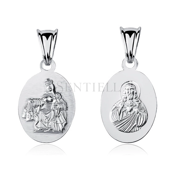 Dwustronny medalik o owalnej formie wykonany ze srebra próby 925, rodowany. Jedna strona przedstawia wizerunek Matki Boskiej Szkaplerznej w wypukłym reliefie, osadzony na delikatnie satynowanej powierzchni, z czytelnie zaznaczonymi fałdami szat i atrybutami ikonograficznymi. Druga strona ukazuje wizerunek Jezusa z Sercem w reliefie, umieszczony na gładkim, polerowanym tle. Krawędzie regularne, profil płaski, forma niewielka i proporcjonalna.