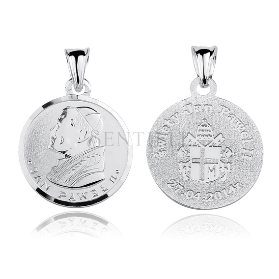 Dwustronny medalik w formie owalnej zawieszki wykonany ze srebra próby 925 o wymiarach 25 x 17 mm. Awers przedstawia profilowy wizerunek Świętego Jana Pawła II w wypukłym reliefie, osadzony na satynowanym tle z gładką, regularną ramką o delikatnie fazowanych krawędziach. Rewers zawiera herb papieski z krzyżem i literą M, otoczony polskimi napisami oraz datą, wykonanymi w precyzyjnym reliefie na matowej powierzchni. Wybrane elementy zostały zaakcentowane diamentowaniem, co podkreśla kontur i czytelność detalu. Całość wykończona w rodzie, o płaskim profilu i równo wyprowadzonych krawędziach. Medalik posiada standardową krawatkę.