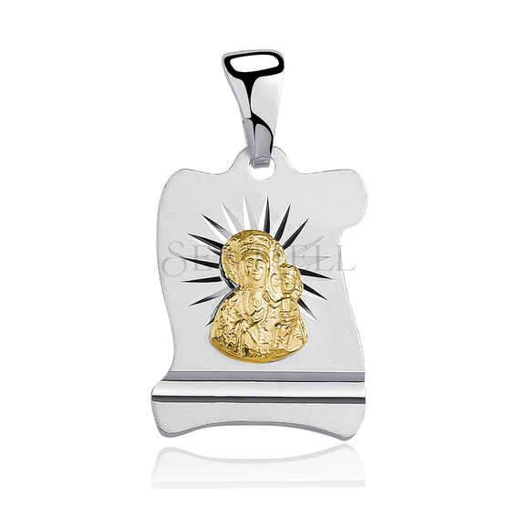 Medalik wykonany ze srebra próby 925 o wymiarach 26 x 14 mm, w nieregularnej, miękko profilowanej formie z charakterystycznym dolnym uskokiem. Centralną część zajmuje relief Matki Boskiej Częstochowskiej z Dzieciątkiem, wykończony warstwą 24K żółtego złota, który wyraźnie kontrastuje z chłodnym odcieniem srebra. Tło medalika opracowane techniką satynowania, natomiast za wizerunkiem widoczny jest promienisty motyw wykonany techniką diamentowania, podkreślający centralną kompozycję. Dolna partia zawieszki została zaakcentowana gładkim, polerowanym pasem. Całość zabezpieczona warstwą rodu. Zawieszka posiada standardową krawatkę.