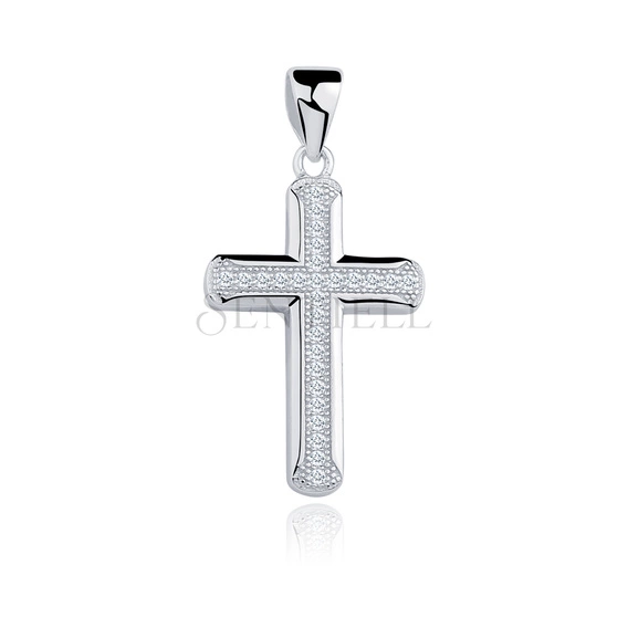 Zawieszka w formie krzyżyka wykonana ze srebra pr. 925, o wymiarach ok. 28 x 14 mm i przybliżonej wadze 1,5 g. Ramiona mają zaokrąglony profil z gładkimi, wypukłymi krawędziami. Front wypełniają ciasno osadzone białe cyrkonie w technice microsetting, tworzące jednolitą, drobną fakturę na całej powierzchni wewnętrznego obrysu krzyża. Tło i boki pozostają gładkie, z równą linią wykończenia. Całość pokryta jest rodowaną powłoką, a górna część elementu wyposażona w klasyczną krawatkę dostosowaną do standardowych łańcuszków.