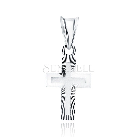 Zawieszka w formie krzyżyka wykonana ze srebra pr. 925, o wymiarach ok. 22 x 10 mm i przybliżonej wadze 0,8 g. Front ma satynowaną powierzchnię z wyraźnie zaznaczonym, pogłębionym konturem ramion. Tło zdobią promieniście ułożone pasma diamentowane, które zbiegają się ku centralnej osi. Krawędzie są gładkie i równe, a całość wykończona rodowaną powłoką. Model wyposażony w klasyczną krawatkę dopasowaną do standardowych łańcuszków.