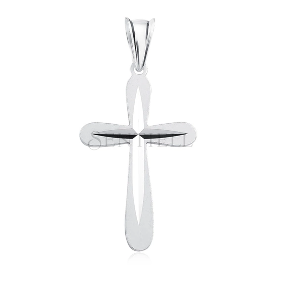 Zawieszka w formie krzyżyka wykonana ze srebra pr. 925, o wymiarach ok. 42 x 21 mm i przybliżonej wadze 1,7 g. Ramiona mają zaokrąglone zakończenia oraz zwężający się ku środkowi profil. Centralnie poprowadzony frez diamentowany tworzy czterokierunkową, ostrą krawędź przecinającą front, kontrastując z gładką satynowaną powierzchnią tła. Element wyposażony jest w rodowaną powłokę oraz klasyczną krawatkę dopasowaną do standardowych łańcuszków.