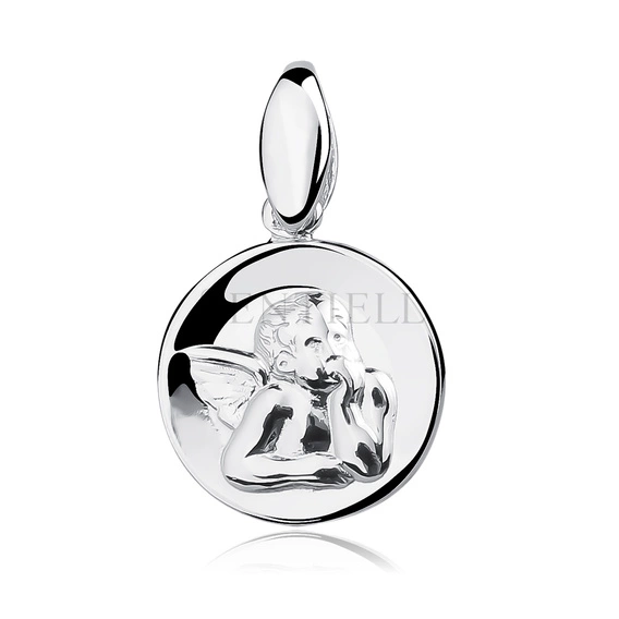 Medalik wykonany ze srebra próby 925 o wymiarach 23 x 14 mm, w okrągłej formie z gładkim, wyraźnie zaznaczonym rantem. Centralną część frontu zajmuje wypukły relief aniołka w ujęciu frontalnym, z widocznymi skrzydłami i detalicznie opracowanym modelunkiem twarzy oraz rąk. Tło jest gładkie i polerowane, tworząc jednolitą powierzchnię podkreślającą relief. Całość wykończona w wysokim połysku, z powierzchnią srebrną pokrytą warstwą rodu. Zawieszka posiada standardową krawatkę.
